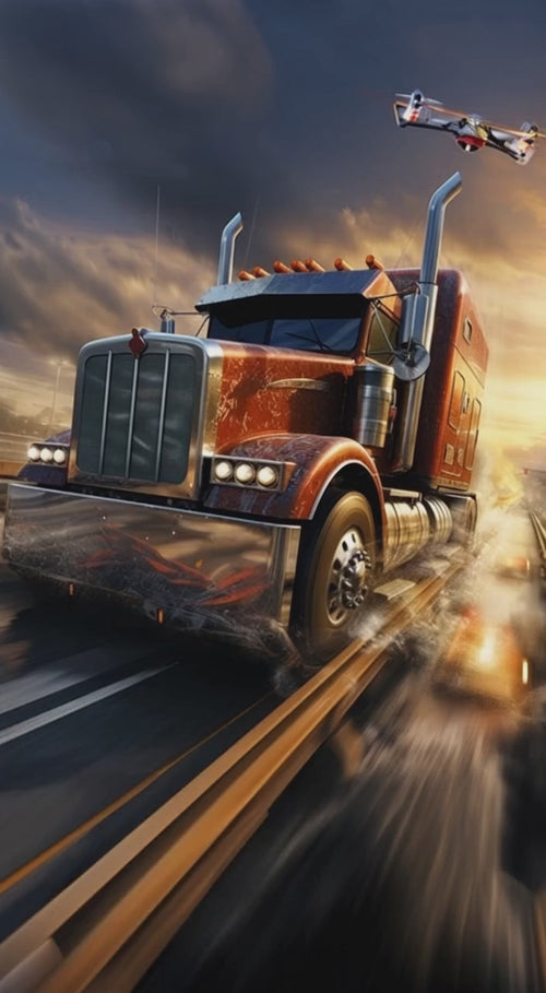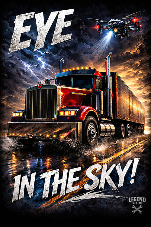 A semi truck cutting through a storm. Above, a police drone spotlight pierces the darkness, watching from above. This is the moment where power meets surveillance, where the road becomes a stage. The Eye in the Sky design captures the raw intensity of 18-wheel culture—the machines that move America, the drivers who command them, and the forces that watch over it all.